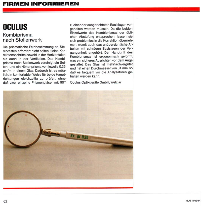 In eine Stielfassung eingesetztes Meßbrillenglas mit prismatischer Wirkung von etwas über 0,35 cm/m, entsprechend der Kombination zweier Prismen von je 0,25 cm/m mit rechtwinklig zueinander angeordneten Basislagen, die auf der Fassung markiert sind. In der MKH dient das Kombiprisma zum probeweisen gleichzeitigen prismatischen Feinabgleich in horizontaler und vertikaler Richtung.